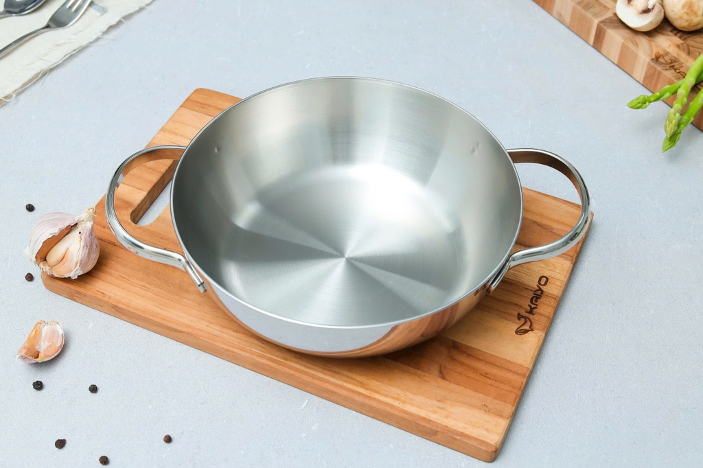 Chảo inox sâu lòng đúc nguyên khối Classic Pro Kaiyo được đúc 3 lớp, thân đáy liền với các chất liệu inox, nhôm cao cấp cùng tay cầm chống nóng, đúc đặc giúp dễ dàng chế biến các món ăn siêu ngon mà tiết kiệm tối đa nhiên liệu và thời gian khi nấu; có thể sử dụng trên mọi loại bếp.
