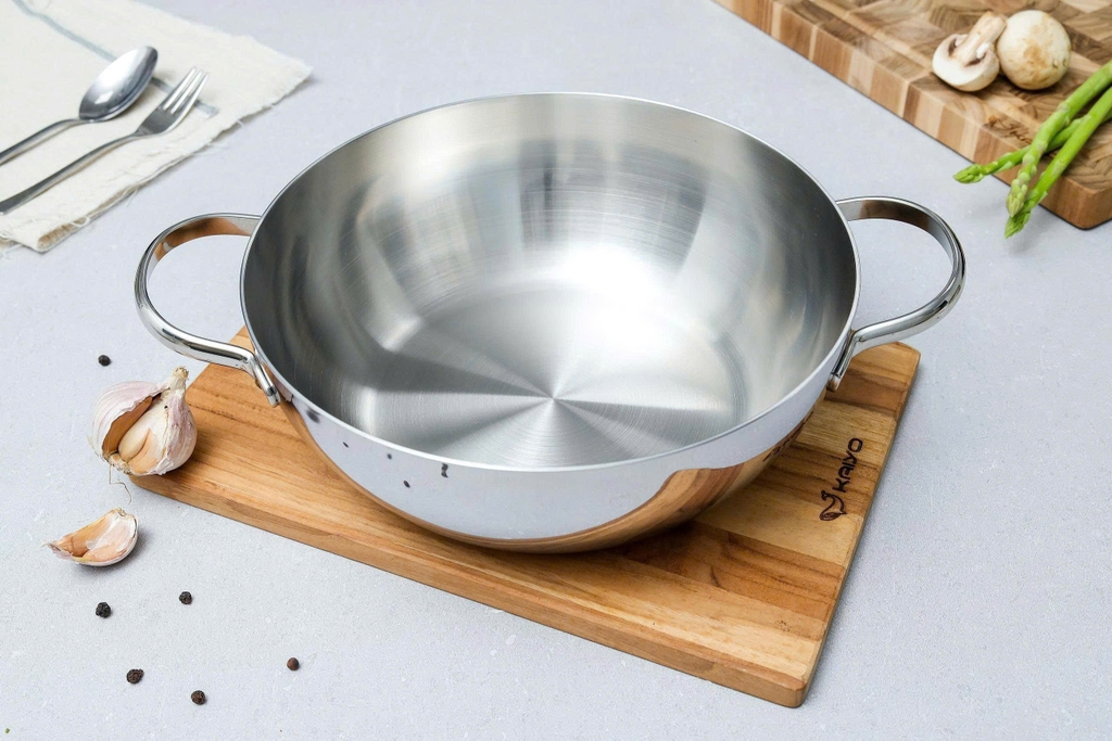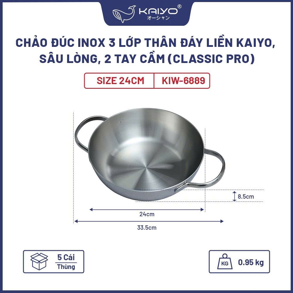 Chảo inox sâu lòng đúc nguyên khối Classic Pro Kaiyo được đúc 3 lớp, thân đáy liền với các chất liệu inox, nhôm cao cấp cùng tay cầm chống nóng, đúc đặc giúp dễ dàng chế biến các món ăn siêu ngon mà tiết kiệm tối đa nhiên liệu và thời gian khi nấu; có thể sử dụng trên mọi loại bếp.