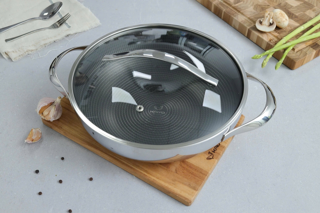 - Nồi chảo đúc inox 3 lớp đáy liền chống dính Quantanium Silver Crown Kaiyo được đúc liền khối thân và đáy, 3 lớp với độ dầy 2.5mm mang lại sự bền bỉ tối ưu trong quá trình sử dụng.