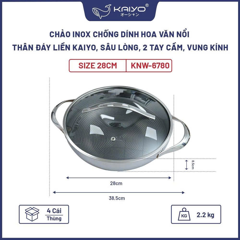 Chảo inox chống dính hoa văn nổi thân đáy liền Kaiyo được đúc nguyên khối thân đáy liền 3 lớp, lòng chảo sử dụng chất liệu inox 18/10 phủ chống dính Quantanium cao cấp giúp dễ dàng chế biến các món ăn ngon, an toàn sức khoẻ mà tiết kiệm tối đa nhiên liệu và thời gian khi nấu; có thể sử dụng trên mọi loại bếp.