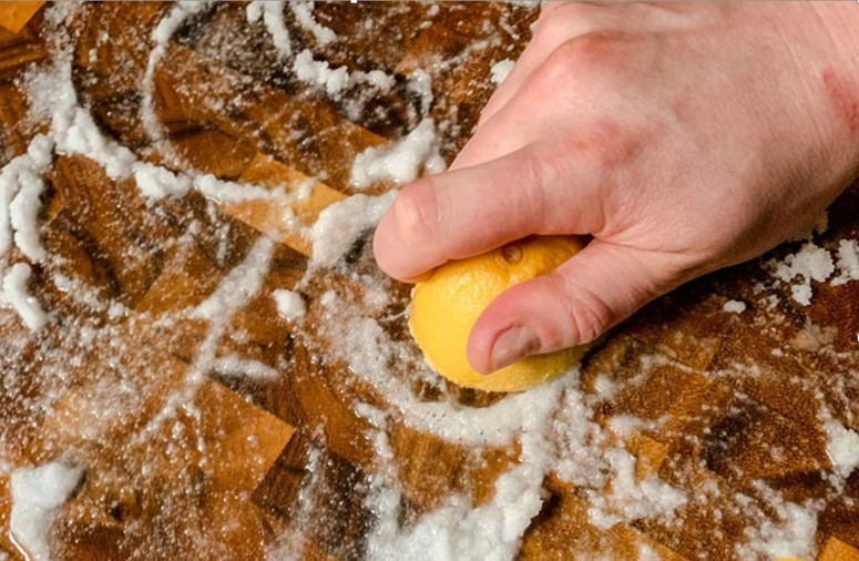 + Dùng chanh và muối: Vắt một chút nước cốt chanh lên bề mặt chiếc thớt rồi rắc muối vào vùng nước chanh và dùng nửa quả chanh chà đều bề mặt thớt. Cuối cùng hãy rửa lại chiếc thớt bằng nước sạch.