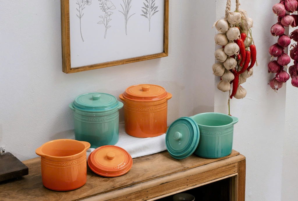 Hũ gốm cầu vồng Kaiyo 2L – đẹp tinh tế với lớp men Ombre, dùng muối dưa cà, đựng mỡ lợn, ngâm tỏi ớt… Chịu nhiệt từ -20°C đến 230°C, an toàn cho lò vi sóng, máy rửa bát. Đa năng – Trang trí siêu xinh!