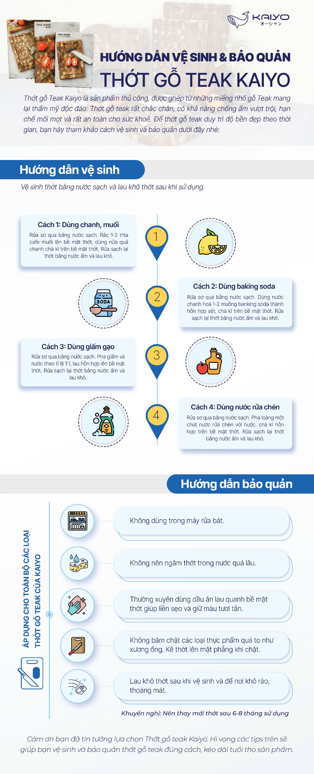 Để duy trì độ bền đẹp của thớt trong quá trình sử dụng, giúp kéo dài tuổi thọ sản phẩm, Kaiyo xin hướng dẫn bạn các cách vệ sinh và bảo quản thớt rất đơn giản sau đây nhé: