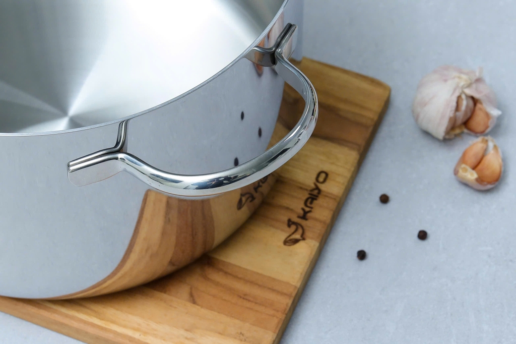 + Kiểu dáng hiện đại, sang trọng: Thiết kế hiện tại với mặt trong là inox satin, mặt ngoài là inox bóng gương cao cấp cùng tay cầm đúc đặc nguyên khối. Nồi Inox Tri-Ply thân đáy liền Kaiyo thực sự mang lại cho không gian bếp gia đình sự sang trọng và đẳng cấp.