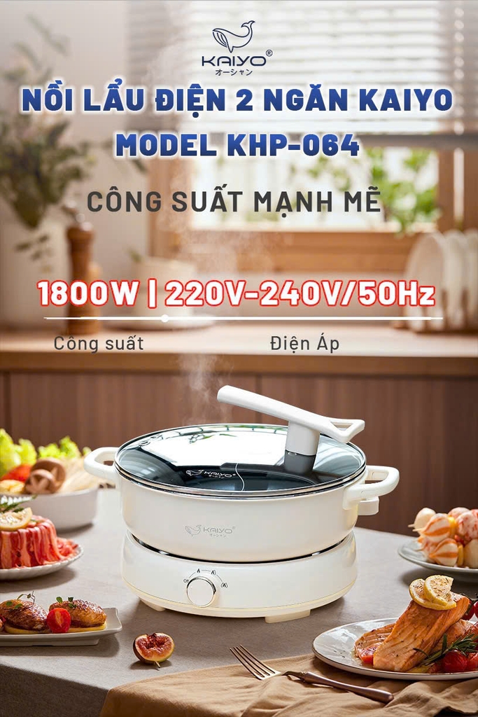 Nồi lẩu điện 2 ngăn Kaiyo, model KHP-064 được thiết kế thông minh 2 ngăn cho phép nấu hai món ăn khác nhau cùng lúc, dung tích đủ lớn, công suất mạnh mẽ, các mức nhiệt nấu tiện lợi sẽ giúp chế biến đa dạng các món ăn: lẩu, hầm/ninh, chiên/xào thơm ngon, chuẩn vị.